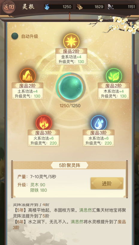 接着去洞府的灵池,前期先把灵根和聚灵阵升一升,可以增加五行属性,以及可以增加功法的属性让你变得更强哦。
