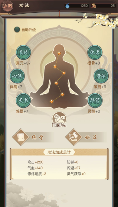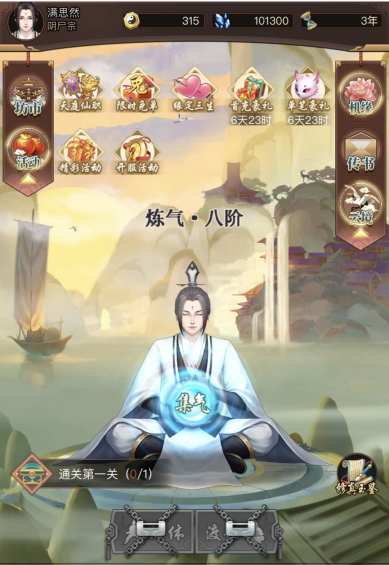这期间,可以做做任务,先把游戏前期资源领取了,加门派,学功法。打坐收集修为,集气提升境界好轻松。先定个小目标,先升级到炼气十阶。十阶可以开启淬体与渡劫玩法,从这里开始,修真之路正式开启。