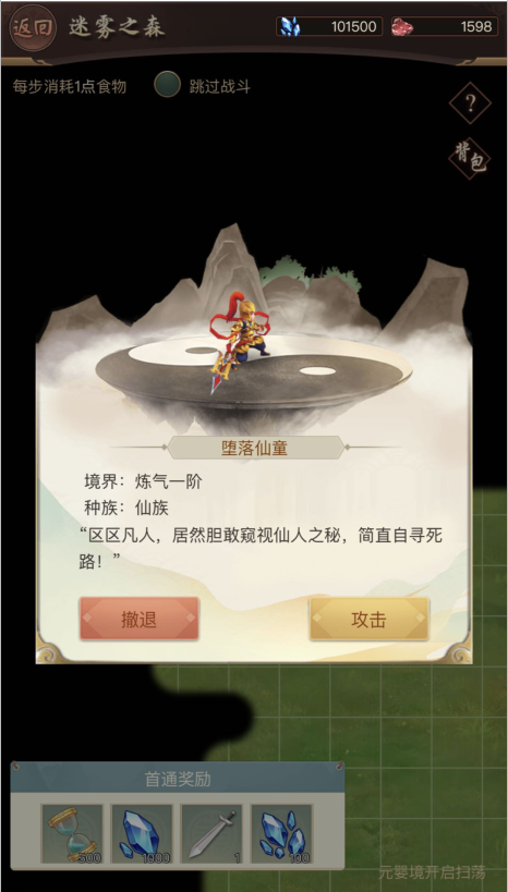 在攒修为提升境界或者渡劫期间,仙友们可以到历练页面,挑战蛮荒大陆的迷雾之森。迷雾之森,每一步消耗一点食物。像自走棋游戏一样,通过行进到不同位置,有不同的奇遇,您可能直接收获到资源,也可能遇到怪物拦路或者堕落神侍、堕落仙人,击败他们可以获得游戏资源和装备。副本中还隐藏着神秘盒子,里面装有特别材料,具体有那些,欢迎来挑战迷雾之森。